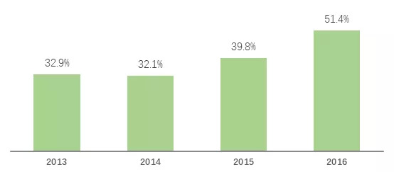 2013年,微博月登陆次数超过15次的用户占比只有不到33%,2014年还出现了轻微的下降。而到了2016年,随着微博的转型,月登陆次数超过15次的用户占比大幅提升,达到了51.4%。