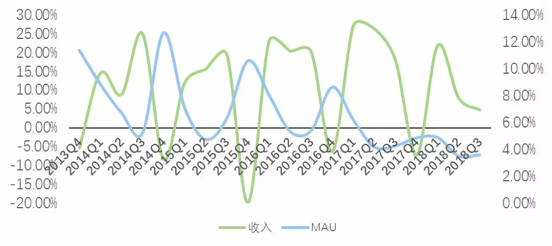(图13,微博MAU和收入的环比增速) 注:MAU为当季最后一个月的MAU