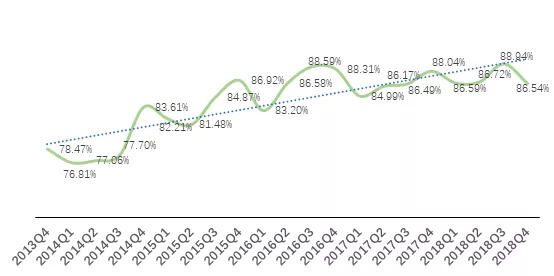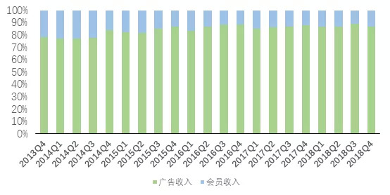 在收入结构上,广告收入可谓是微博的“立身之本”。近年来,广告收入占总收入的比重波段式上升,大部分稳定在80%以上。2018年四季报显示,微博广告收入4.8亿美元,较去年同期增长27.67%,较上季度增长4.72%。
