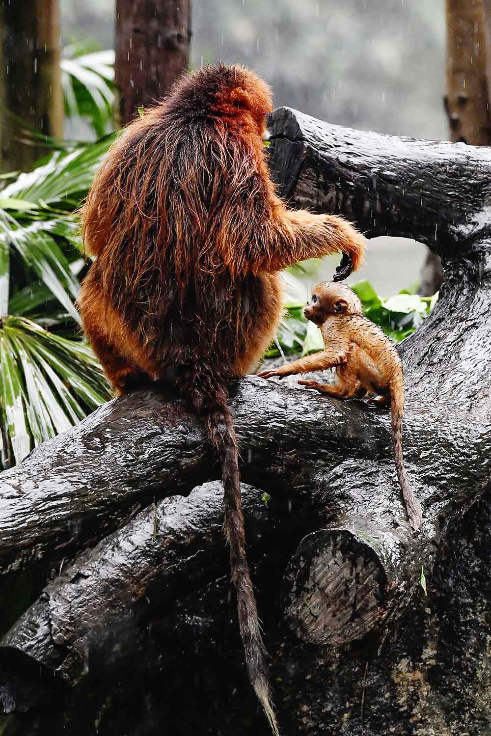 2019年4月12日,广州长隆野生动物世界金丝猴王国展区内,刚满月的川金丝猴小公主“小春”正式首展啦!新生川金丝猴“小春”与母亲。