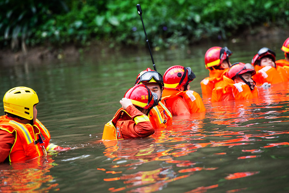 2019年4月12日,广东深圳,11日晚间,暴雨突袭深圳引发洪水,截至12日下午已造成7人死亡4人失联。搜寻失踪人员的工作仍在展开。下午,在罗湖区沙湾河流域,潜水员利用声纳装置搜寻失踪者,消防员也在河道“拉网”组成人墙,积极搜寻失踪人员。