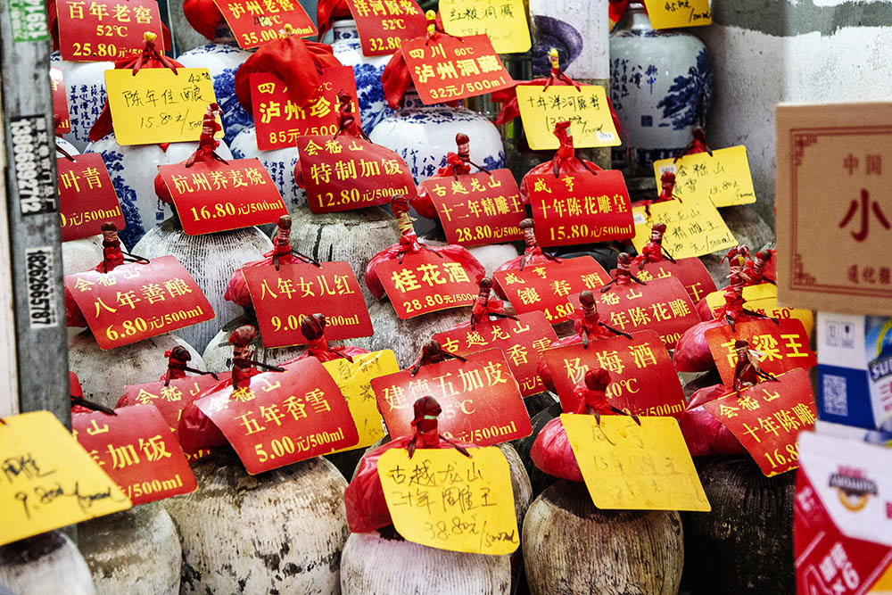 2019年4月12日,上海物价CPI环比上涨,但菜市场的蔬菜价格、猪肉价格上涨幅度不大,市民很坦然能够接受。图为黄酒店内的各种料酒。