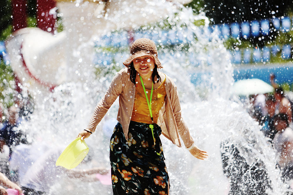 2019年4月13日,云南省昆明市云南民族村开展“傣历1381年昆明泼水节”活动。当天,民族村内丰富多彩的文化活动吸引来自各地的众多游客市民和少数民族民众一起“撒泼”狂欢,绚烂绽放的水花,场面十分壮观。