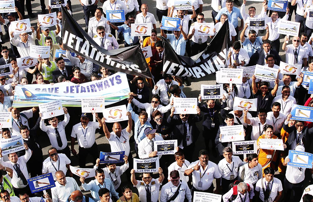 当地时间2019年4月13日,印度新德里,印度捷特航空公司员工集会游行,抗议拖欠工资。据报道,印度国内最早开始私营的航空公司捷特航空(Jet Airways),近年来深陷债务窘境,变得愈发“不能自理”。今年2月份被曝“1印度卢比卖身”,4月12日,这家公司不得不取消了所有国际航线。