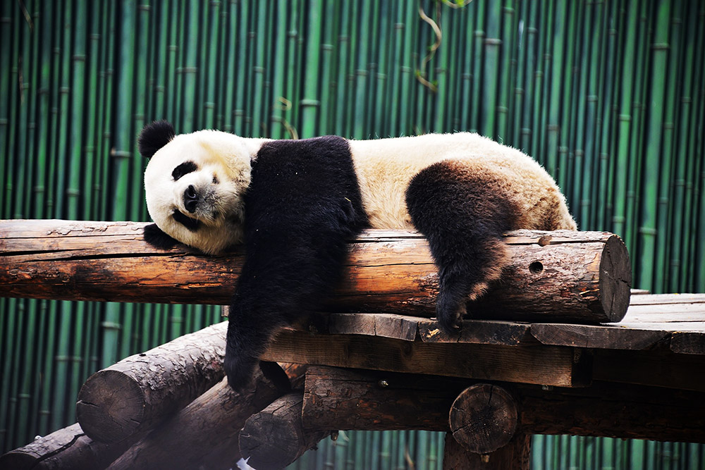 2019年4月13日,北京动物园,大熊猫搂着木桩酣睡休息。春回大地,花儿朵朵充满了春意,国宝大熊猫们时而像“趴趴熊”般趴在地上休息,时而漫步花丛或坐在地上闷头大吃。
