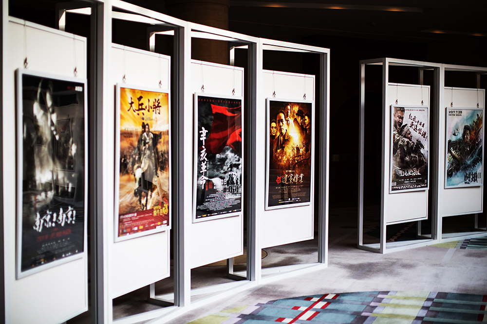 2019年4月14日,第九届北京国际电影节新中国成立70周年“光影七十年奋进新时代”主题论坛在北京国际饭店国际厅举行。论坛现场展示的电影海报。