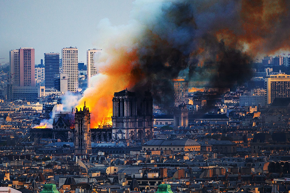 当地时间2019年4月15日,法国巴黎,法国巴黎著名地标巴黎圣母院起火,火情迅速蔓延,塔尖在大火中坍塌。