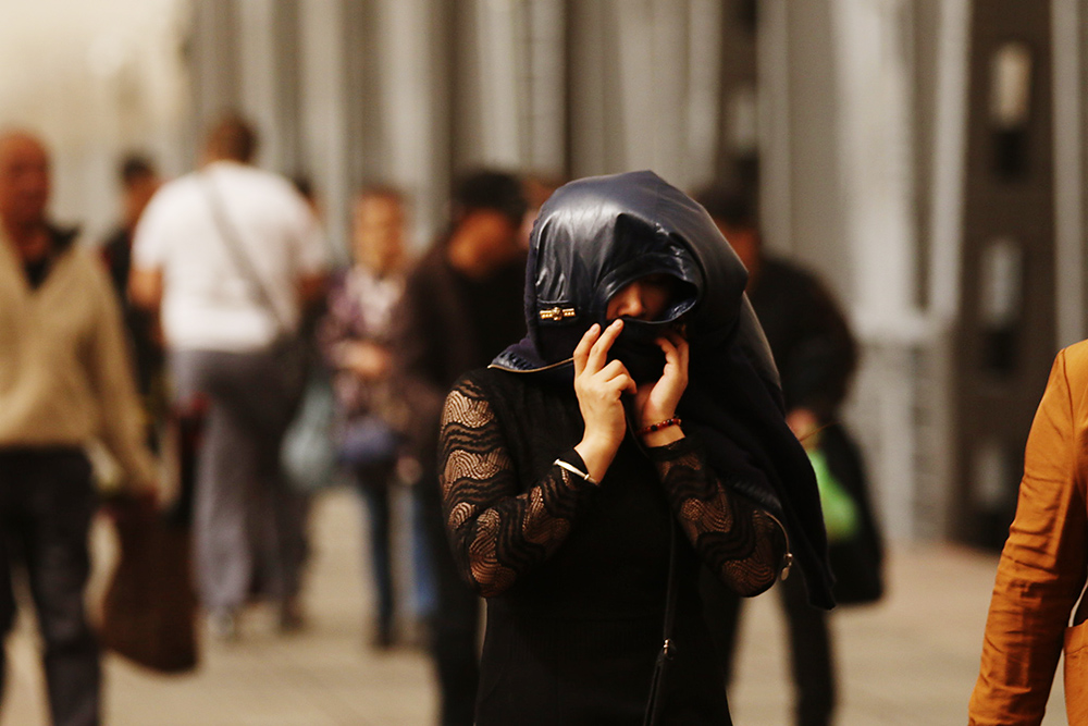 2019年4月16日,黑龙江省哈尔滨市,最大风力8级的阵风携带沙尘袭卷而来,漫天灰尘漫天灰黄。市民纷纷戴上口罩、纱巾抵挡尘土。