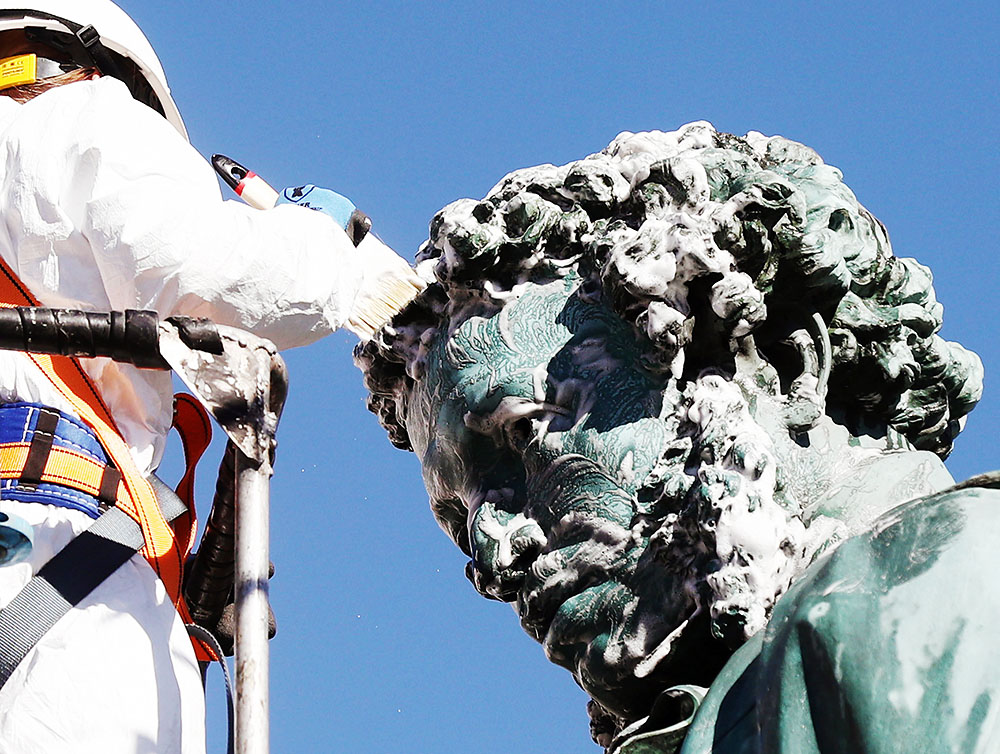当地时间2019年4月16日,俄罗斯莫斯科,市政工作者对位于莫斯科普希金广场的著名诗人普希金的雕像及其周边进行清洗。
