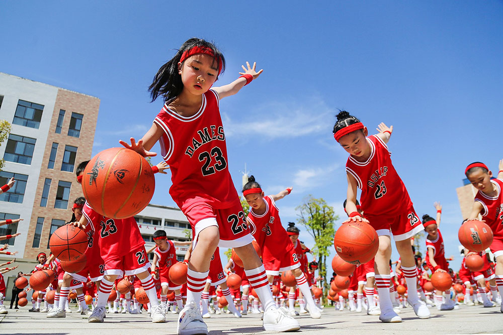 2019年4月17日,江西省峡江县实验二小学生正在练习球操。