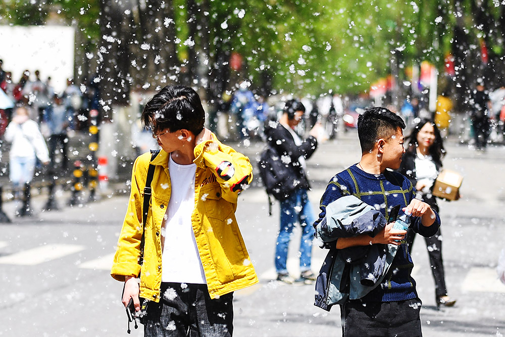 2019年4月17日,山西省太原市,杨柳絮漫天纷飞如同鹅毛大雪,市民戴口罩出行。随着春季气温逐渐升高,杨树柳树开始吐絮,这也让路上行人烦恼不已。