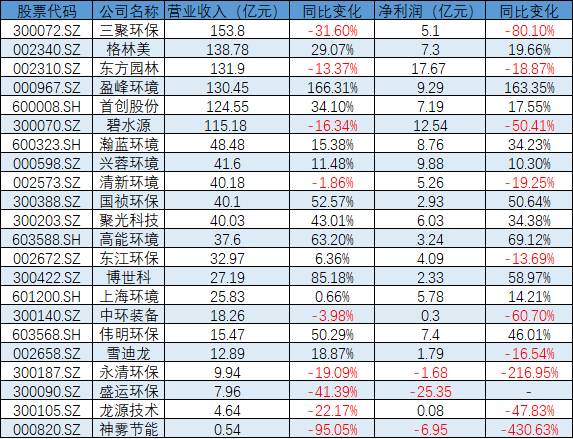 据界面新闻不完全统计,截至4月16日,在已发布年报或业绩快报的环保企业中,近半企业净利下滑或亏损。
