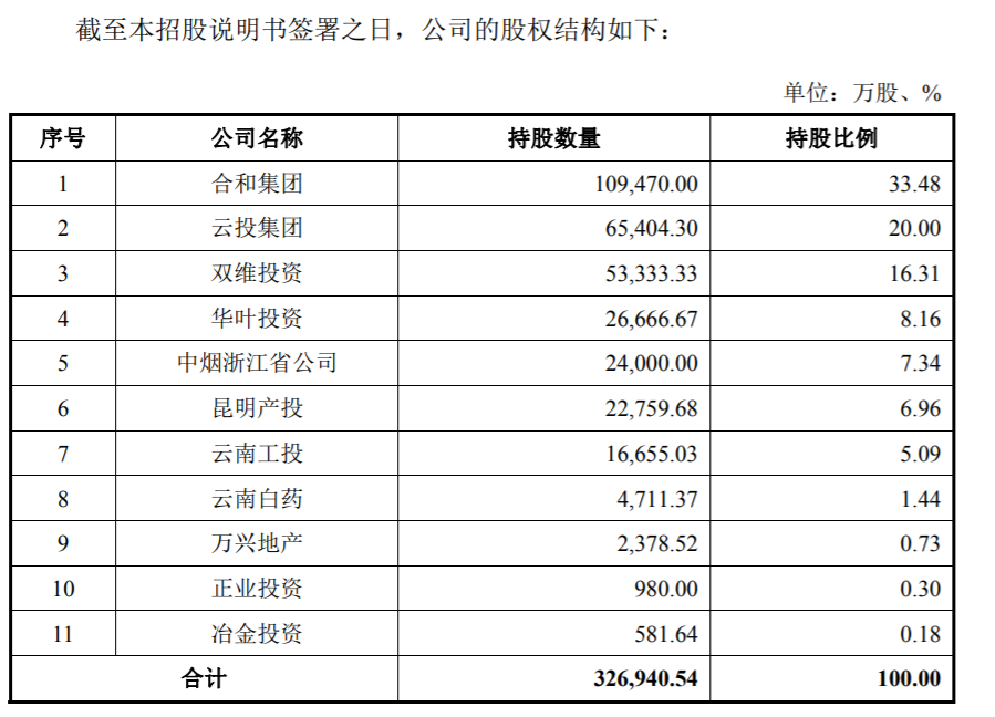截至招股说明书签署之日,合和集团持有公司10.5亿股股份,占本次发行前总股本的 33.48%,为公司的控股股东。红塔集团持有合和集团 75.00% 的股权,云南中烟持有红塔集团 100.00%的股权,中烟总公司持有云南中烟 100.00%的股权,中烟总公司系本公司实际控制人。