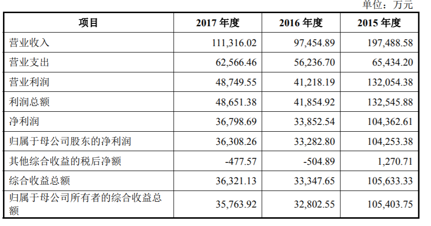 2015年至2017年,红塔证券实现的营业收入分别约为19.75亿元、9.75亿元和11.13亿元,对应实现归属于母公司股东的净利润分别约为10.43亿元、3.33亿元和3.63亿元。