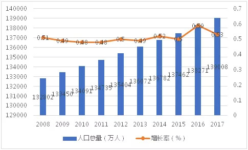 2008-2017年中国人口总量及增速放缓【数据来源:中国人口和就业统计年鉴】