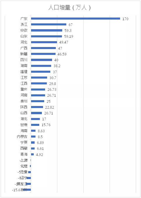 2017年中国各省常住人口增量排行【数据来源:中国人口和就业统计年鉴】