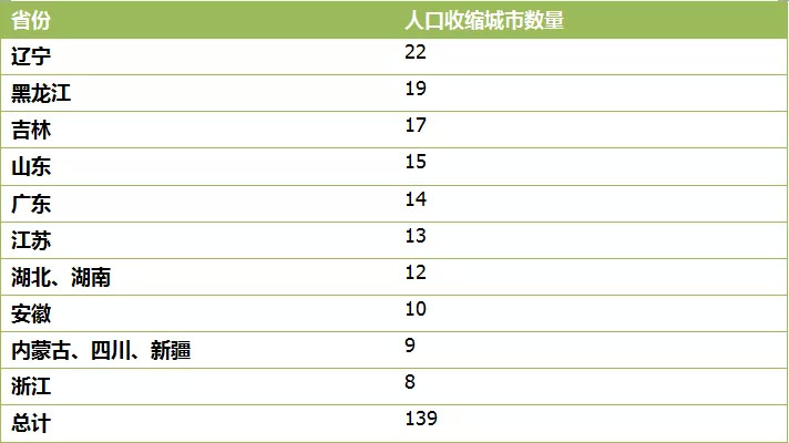 各省基于人口维度的收缩城市数量(排名前10)【数据来源:2010年第六次全国人口普查数据】