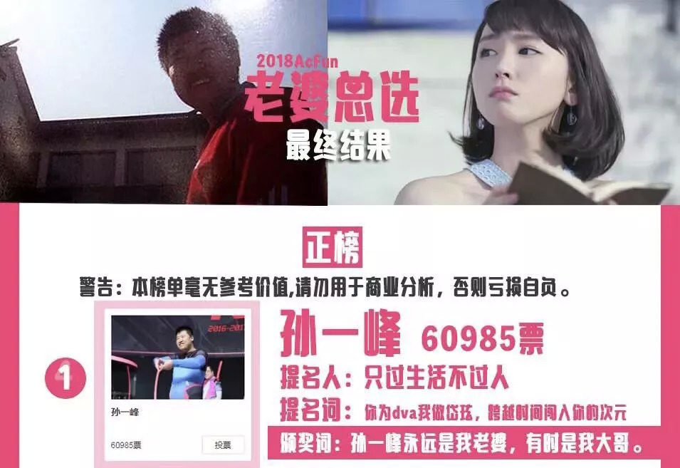 他去年在站内策划了一次“老婆总选”,中途活动跑偏,一大堆人把电竞选手孙一峰投到了第一的位置,很符合二次元“反主流”的作风,这也让整个活动在有了不小的反响。“关于要不要把孙一峰排除,当时内部也分歧,后来双方折中,决定控制一下,只能有一个,不能有第二个。”
