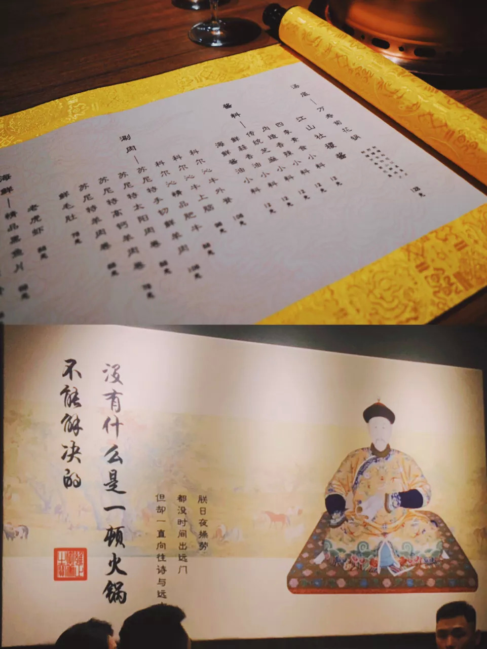 以朝隆《紫光阁赐宴图》为空间主题的故宫角楼餐厅,还原的是宫迁御食的场景与风貌,当的上是一句“朕的火锅”。就连菜名也走“皇家路线”,“千里江山蘸酱”、“遇兰贵人”等均令人所津津乐道。