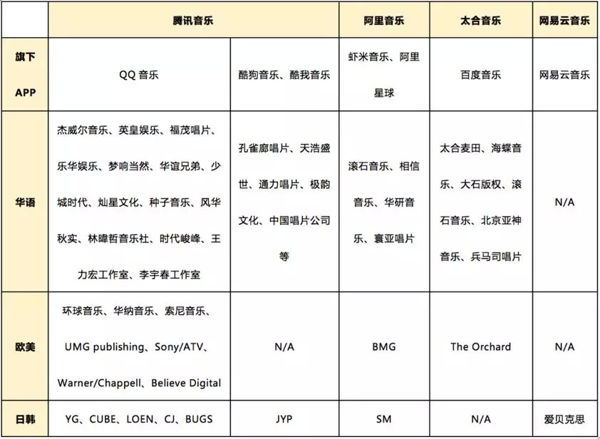 在盗版音乐泛滥的时代,中国平台和用户对于音乐版权并没有什么概念,这也正是影响早期中国音乐平台发展的重要因素之一。2015年是中国音乐产业从盗版时代到正版时代过度的分水岭,自此腾讯音乐、阿里音乐和网易云音乐掀起了长达两年的轰轰烈烈的版权大战。其中腾讯音乐和阿里音乐之间的对战最为激烈。财大气粗的腾讯音乐娱乐集团,拿下了华纳、环球和索尼全球三大顶部唱片公司版权,此外还有华谊、英皇娱乐、杰威尔等知名唱片公司版权;一直想要做成泛娱乐业务的阿里同样不甘示弱,手中持有滚石、相信、BMG、S.M.等知名唱片公司版权。