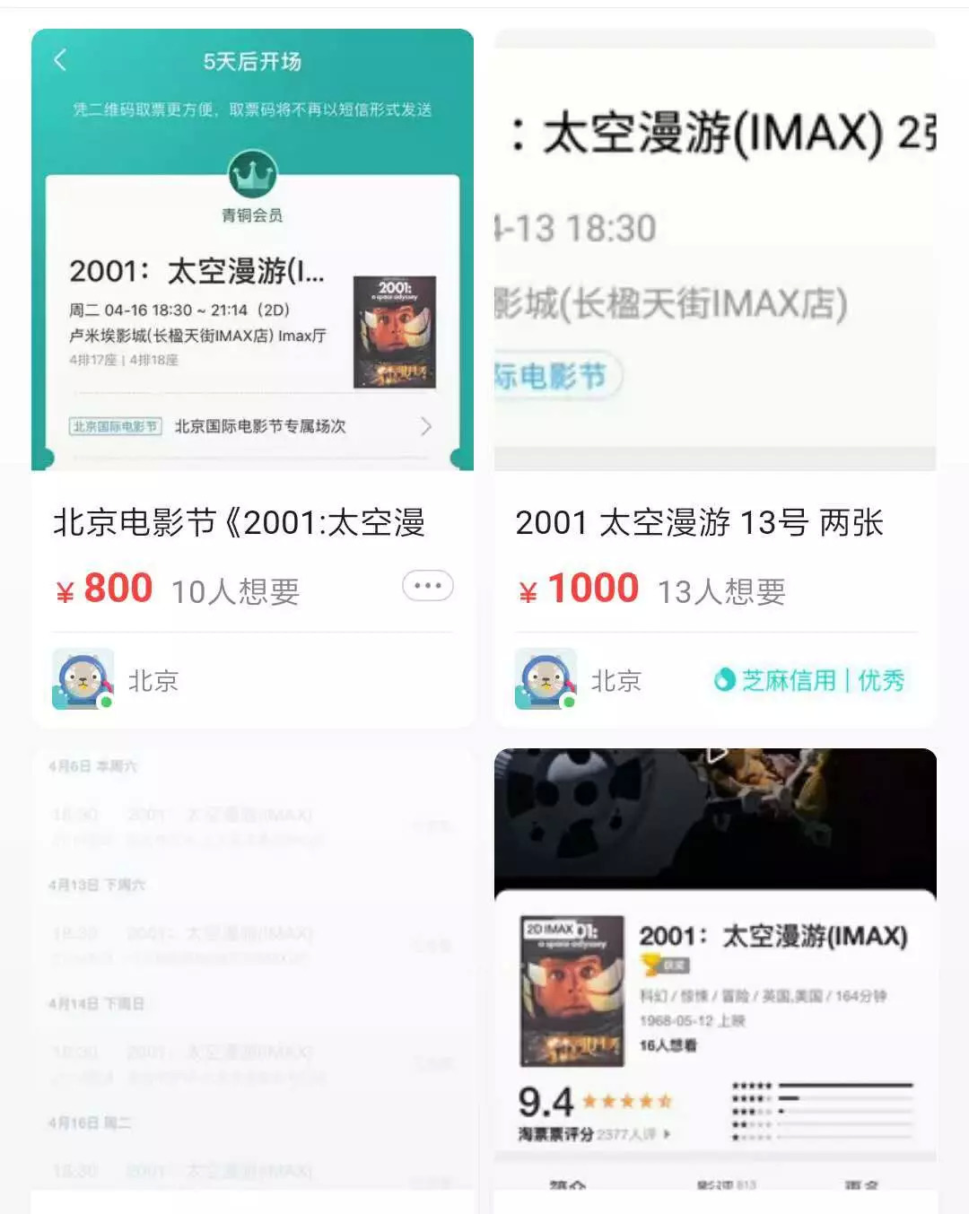 “北影节的《2001太空漫游》五秒内上千个座位被瞬间抢光,闲鱼上已经卖到800块了”