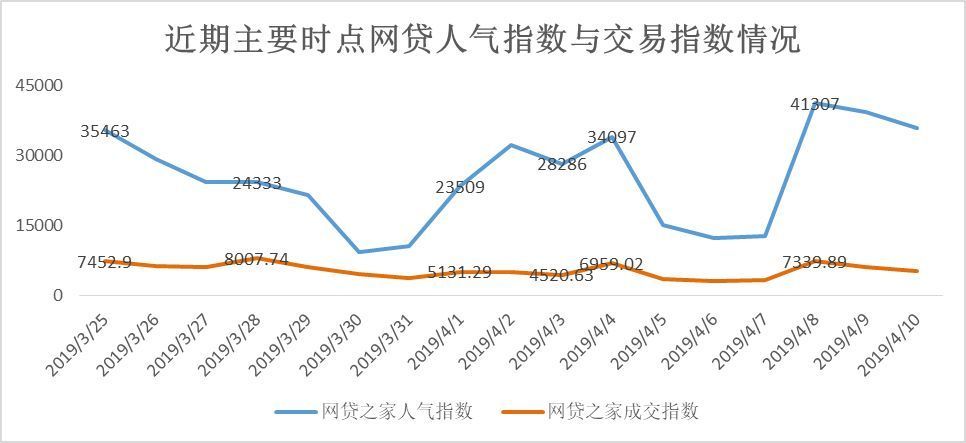 与市场反应不同,网贷人气指数受到的影响较小。8日当日(周一),网贷之家人气指数达到41307,创下年内最高水平。与之相对应的成交指数为7339.89,高于4月1日(前周周一)的5131.29,也仅略低于3月25日(两周前周一)的7452.9。