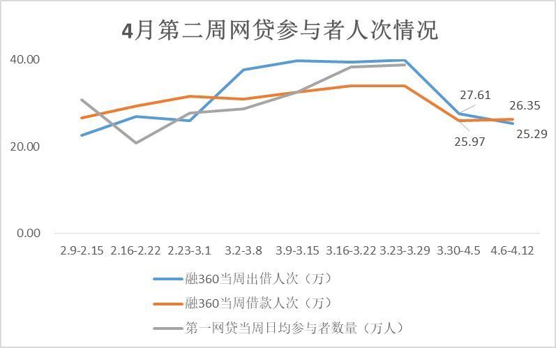 融360发布的数据显示,4月第二周,网贷行业日均出借人次25.29万,日均借款人次为26.35万,此前一周(3月30日至4月5日)的出借人次和借款人次分别为27.61万和25.97万。借款人次在4月第二周回升,但仍低于3月日均32.87万人次的水平;出借人次持续下降,远低于3月39.26万次的平均水平。