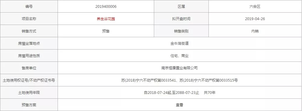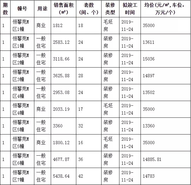 南京恒大养生谷4月17日领取恒馨苑M区1-8幢、恒馨苑P区1-9幢房源销许,共548套房源销许,户型建筑面积81-146㎡,精装交付,拟竣工时间为2019年11月24日。