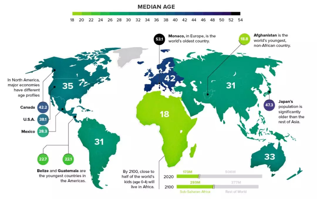 通过和其他大洲比较后,我们可以更加直观的感受到非洲的优势。2019年2月,比尔和梅林达-盖茨基金会(Bill and Melinda Gates Foundation)发布的报告显示,非洲的年龄中位数只有18岁,比亚洲和南美洲低了13岁,比欧洲低了24岁。