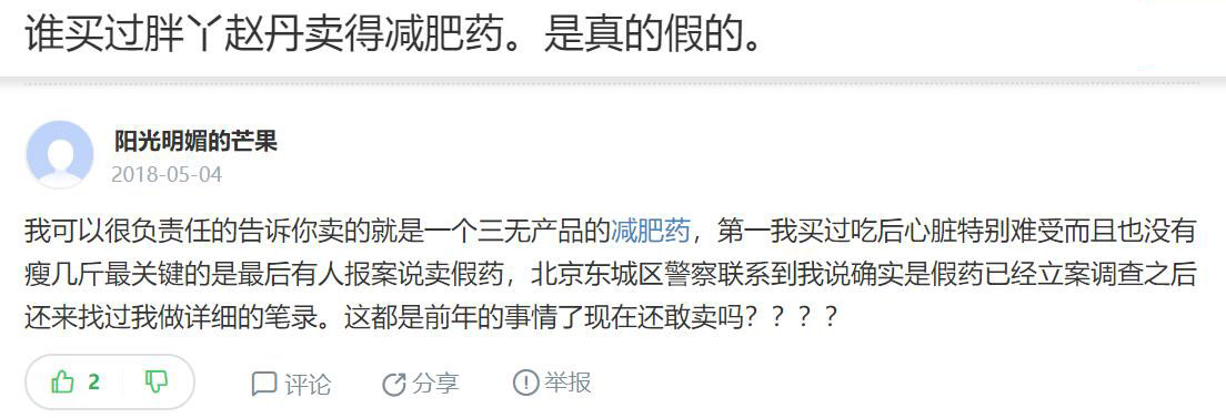界面新闻查阅资料发现,2017年,百度知道有多条与“胖丫”、“减肥药”相关的消息,例如发布“胖丫吃的减肥药叫什么”、“胖丫赵丹在映客卖的减肥药可信吗”之类的问题。其中,在一条“谁买过胖丫赵丹卖得减肥药,是真的假的”问题下,一位名叫“阳光明媚的芒果”的用户在2018年5月留言称,该减肥药是三无产品,自己服用后不仅没减肥效果,还引起心脏不适。此外,她还提到北京东城区警察曾告知此药确实是假药,已立案调查,还找其做过详细笔录。