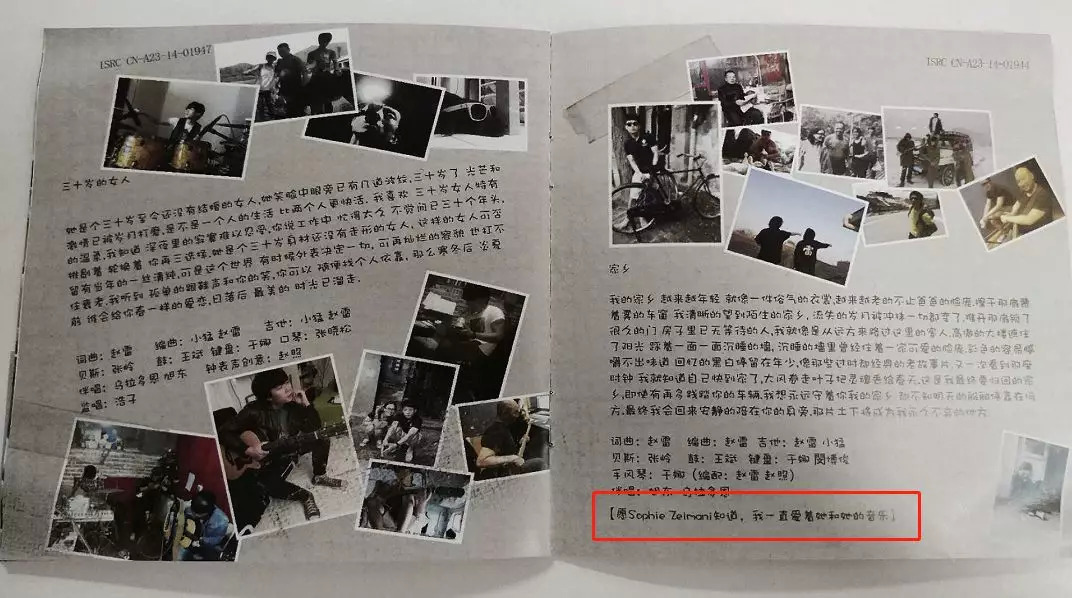 时间来到2014年,广受年轻歌迷喜爱的中国民谣歌手赵雷,用致敬的方式在个人专辑《吉姆餐厅》里,收录了一首改编自苏菲·珊曼妮的歌曲,并在歌词页富有深情地写道:“愿SophieZelmani,我一直爱着她和她的音乐”。