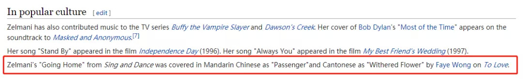 如今,在海外通行的维基百科上,关于苏菲·珊曼妮的介绍里,依然能看到关于王菲的翻唱让其在中国走红的历史痕迹。