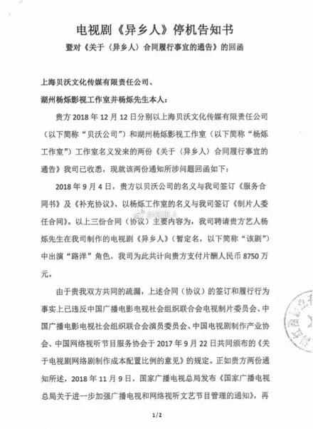 没想到杨烁竟然来了个回马枪,被电视剧《异乡人》剧组公开喊话,称其拒绝履行限薪令,8750万元天价片酬导致《异乡人》剧组停工。