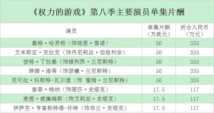 《Variety》杂志曾报道,《权力的游戏》第八季每一集的成本都会让HBO至少花费1500万美元。这意味着第八季中一众主演的片酬占影片成本比例不超过20%。