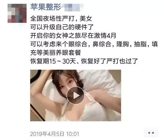 在风声紧的时候,他直接在朋友圈揽客:“全国夜场严打,美女可以升级自己的硬件了,可以考虑来个眼综合、鼻综合、隆胸、抽脂、填充等美丽养眼套餐,恢复期15到30天,恢复好了严打也过了。”