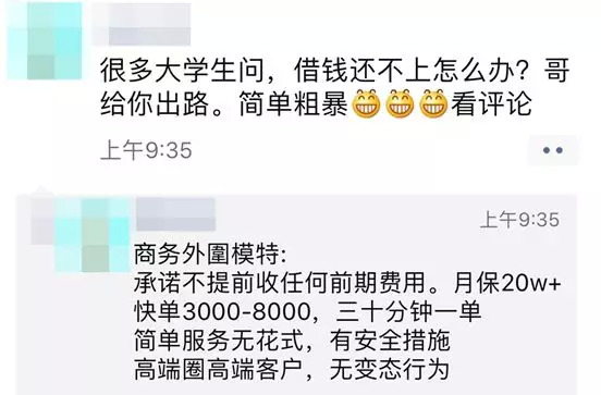 比如,一家放贷平台直接在朋友圈写道:“很多大学生问,借钱还不上怎么办?哥给你出路,商务外围模特,快单3000到8000元,三十分钟一单,简单服务无花式,有安全措施,高端圈高端客户,无变态行为。”