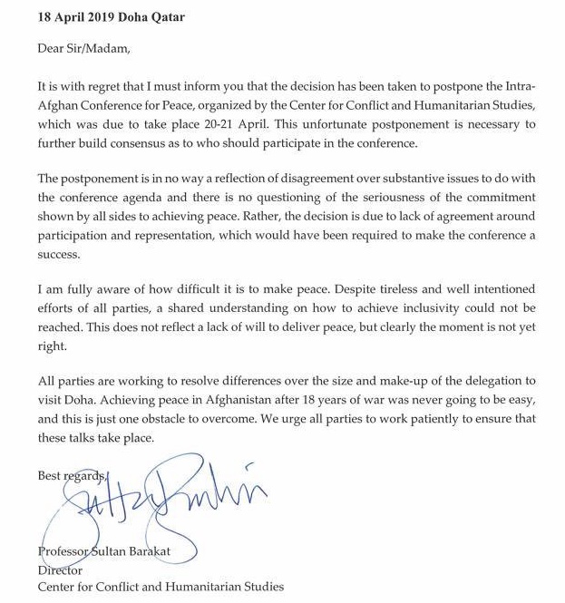 该中心负责人巴拉凯特(Sultan Barakat)4月18日发表声明宣布,由于各方对谈判代表团的人数和成员存在分歧,“阿富汗内部和平会议”被迫延期。