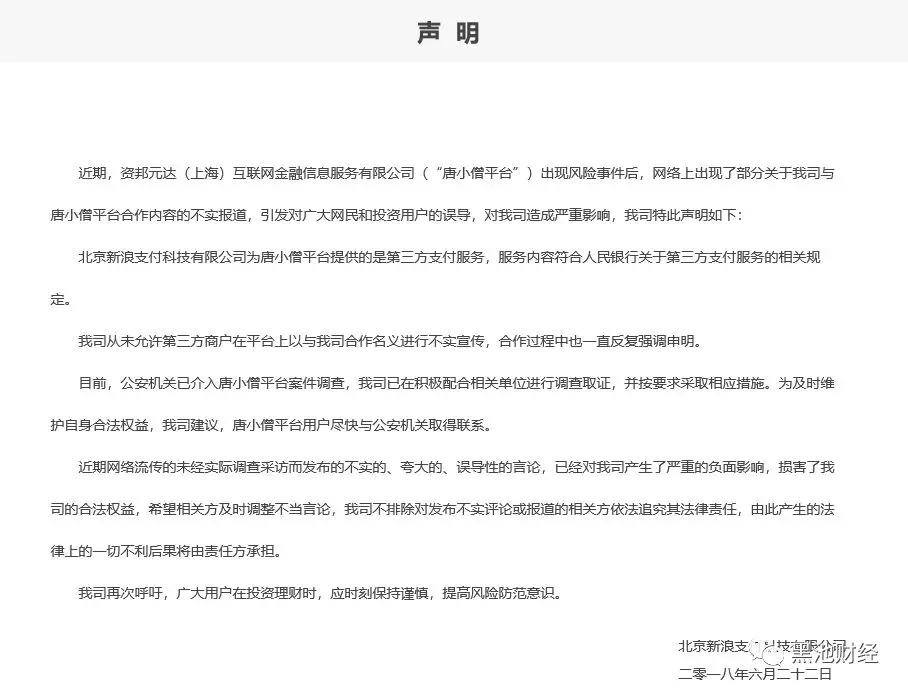 除了沃顿金服,唐小僧(资邦元达(上海)互联网金融信息服务有限公司)暴雷后,其投资者也将矛头纷纷指向了新浪支付。
