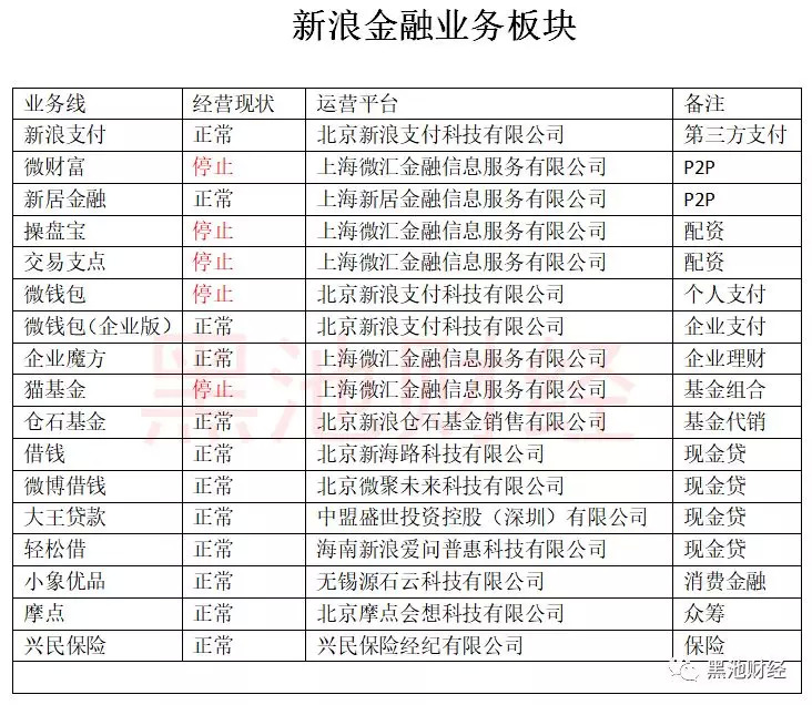 到此,除了新浪支付业务之外,新浪在金融业务上的试水应该说并不成功,股票配资业务由于政策和市场原因相继停止,而微财富和新居金融的P2P业务也并不顺利。这些业务主要通过新浪支付、微汇金融、新居金融三个平台来运营。