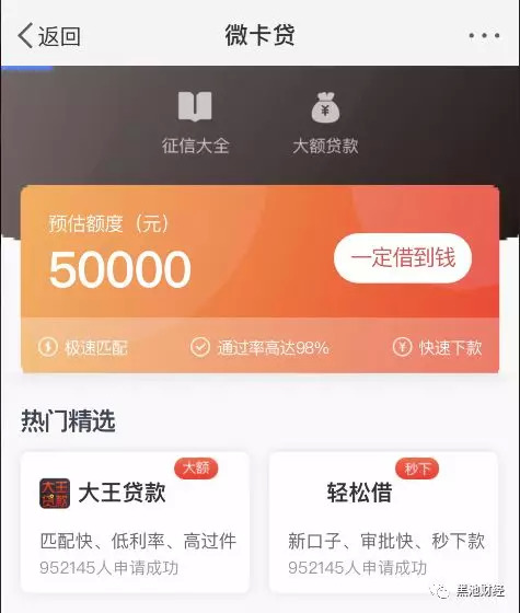除了微博借钱,新浪的现金贷产品还有大王贷款 和轻松借(钞急好借),微博钱包通过“办卡速贷”为两款产品导流。
