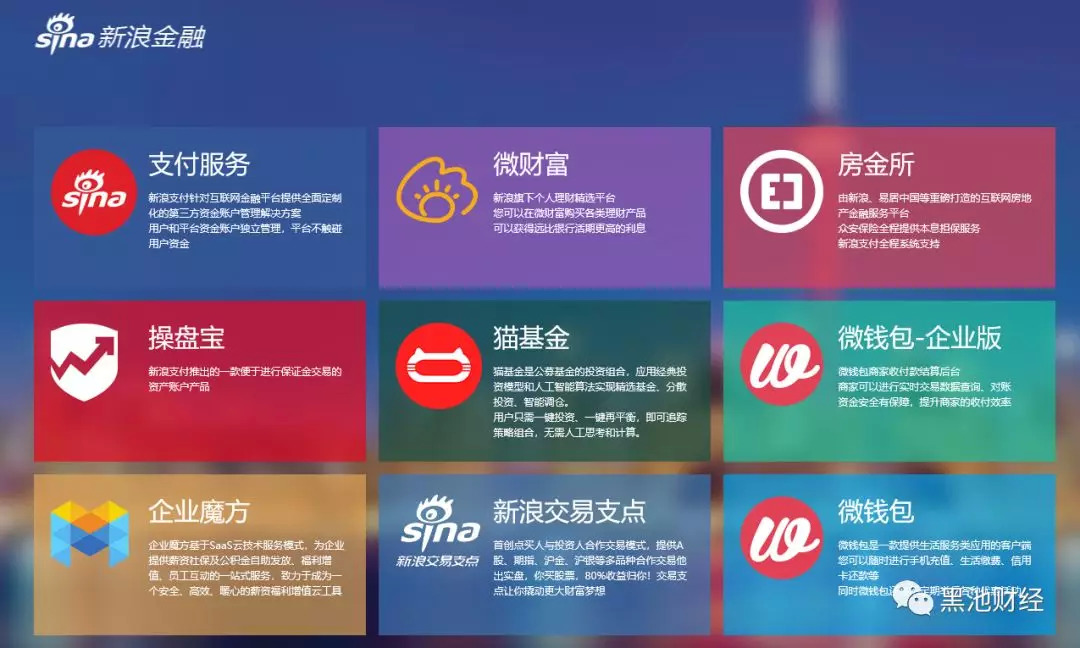 在对外公布的旧版新浪金融官网上,无论微财富,房金所,还是新浪支付都归属于新浪金融旗下,除此之外,还有操盘宝、交易支点、微钱包、猫基金、企业魔方等产品线。