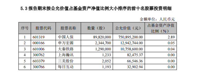 招商配售在2018年末时重仓了中国人保、大秦铁路、申万宏源三只股票,至一季度末时,该基金的重仓股增加至6只,其中上海瀚讯、三美股份、每日互动均为新股。
