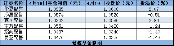 截至4月19日收盘,华夏配售、嘉实配售、添富配售、南方配售、招商配售、易方达配售场内涨幅分别为1.63%、2.02%、1.15%、1.26%、1.08%、1.18%,平均上涨1.38%,而同日沪指涨幅为0.63%、深指涨幅为1.27%。