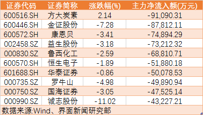 在本周主力资金持续净流出个股中,共计125只个股累计主力资金净流出额超过1亿元,较上周减少139只。这其中,方大炭素(600516.SH)、金证股份(600446.SH)、康恩贝(600572.SH)等个股本周遭主力抛售幅度最大,其累计净流出额分别为9.11亿元、8.78亿元、7.49亿元。