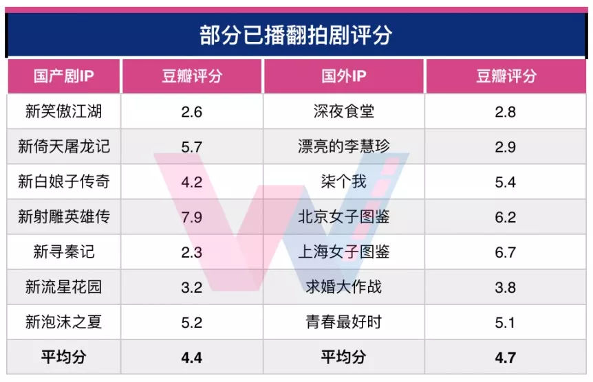 网络大电影盘点了近几年播出的翻拍剧,选取了其中知名度较高的14部,统计其豆瓣评分。发现国产IP平均分为4.4,国外热门IP评分也只有4.7,还是多亏了去年一部《新射雕英雄传》拉分。“凄凄惨惨戚戚”用来形容翻拍剧的口碑,再适合不过。