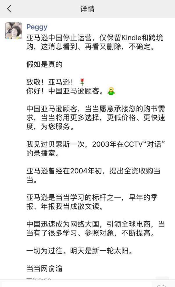 俞渝在个人朋友圈还向亚马逊中国顾客温情喊话,当当愿意承接您的购书需求,当当将用更多选择、更低价格、更快速度、为您服务。