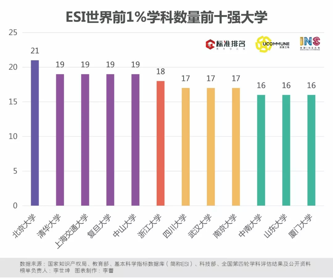 最新的ESI世界前1%的学科数量最多的北京大学,有21个学科入榜;清华大学、上海交通大学、复旦大学、中山大学紧随其后并列第二;中南大学、厦门大学也位居前十。