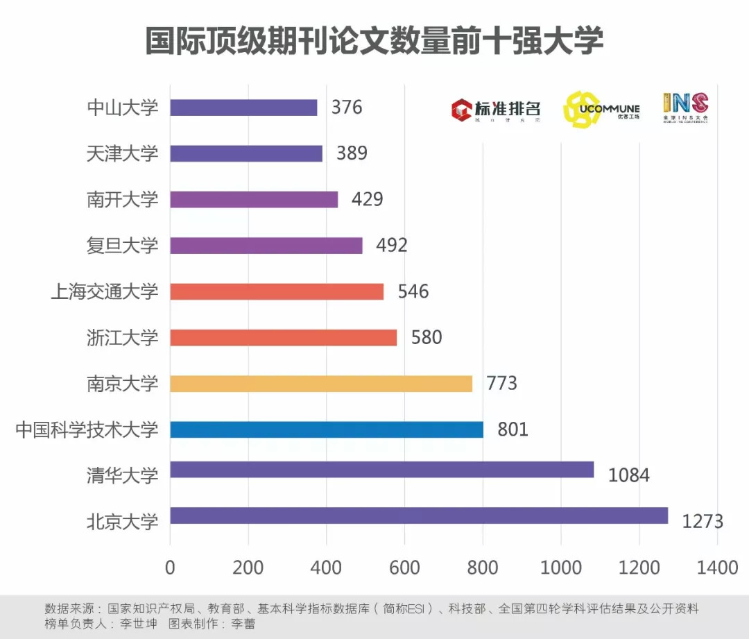文理类大学与医科类大学往往是论文发表数量较多的高校。在国际顶级期刊论文数量方面,北京大学依然高居首位;天津大学、中山大学也入榜前十。