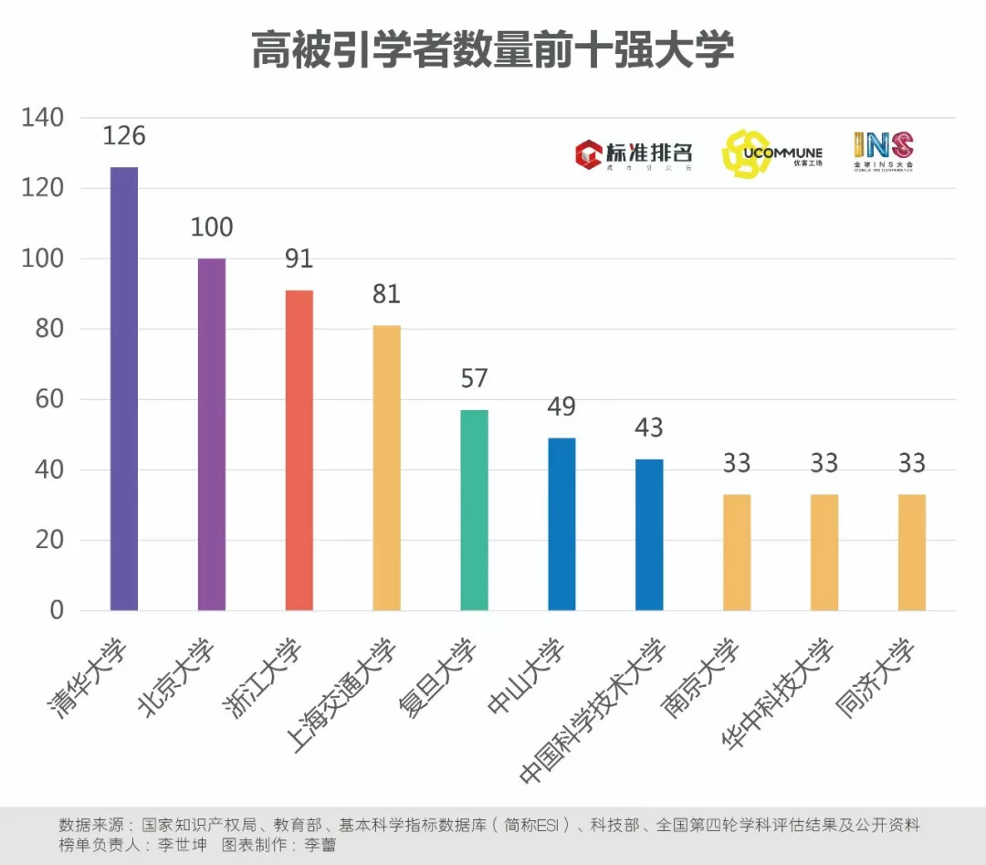 论文被高引用的学者数量方面,清华大学占据强势地位,位列第一;北京大学紧随其后;华中科技大学、同济大学入榜前十。