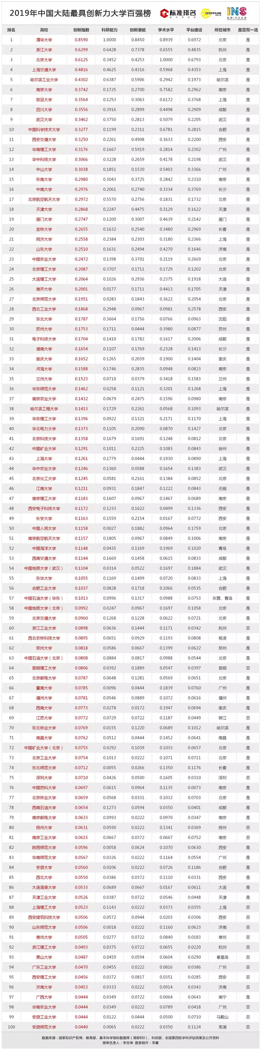 从前20名高校名次变化来看,除了前五的高校保持稳定外,第6-20名的高校基本都处于混战当中。最后的彩蛋就是2019中国大陆最具创新力大学百强榜的终极名单了。来看看你的大学入榜了没——